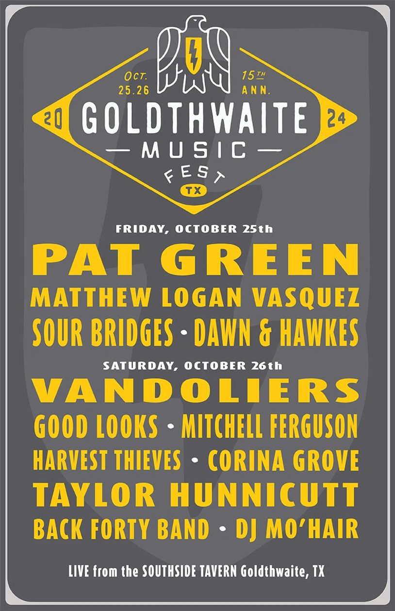 Pat Green • Matthew Logan Vasquez • Sour Bridges • Dawn & Hawkes • Vandoliers • Good Looks • Mitchell Ferguson • Harvest Thieves • Corina Grove • Taylor Hunnicutt • Back Forty Band • DJ Mo'Hair